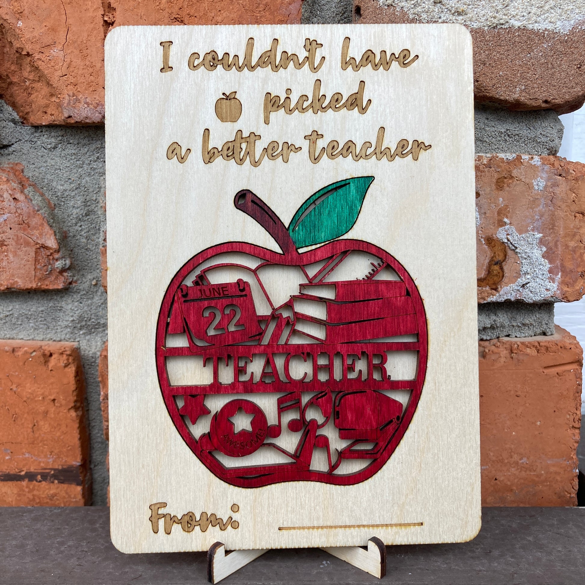 Sweet little gift for the teacher. This 5x7 card/puzzle has a removable apple that can displayed on the stand or hung with a ribbon. Can be customized with date of choice, June 22 shown here, along with Teacher’s name and your child’s name.