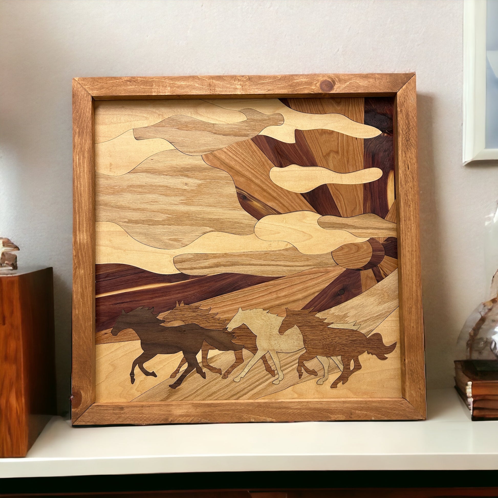 features walnut, cherry, mahogany, maple, cedar and oak. Framed in stained pine.